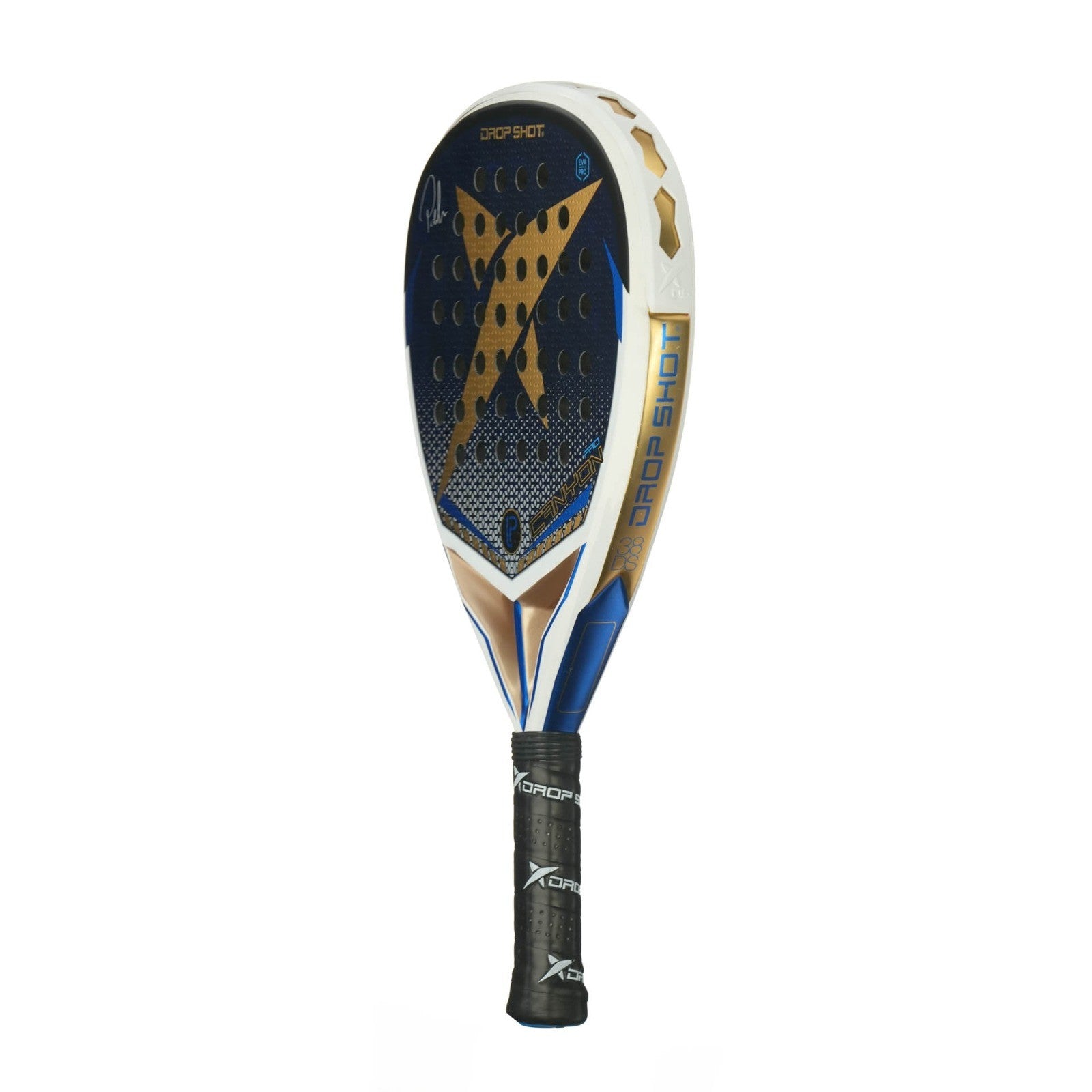 Una pala de pádel Drop Shot Canyon Pro que brilla por su confección, pero también por su estética. Elegante, dinámica y deportiva a partes iguales, esta pala de pádel luce sobre un fondo blanco que contrasta a la perfección con los detalles dorados y azules que monopolizan sus caras y que permiten al Look tornasolado trabajar con la incidencia de la luz para generar diferentes espacios cromáticos.